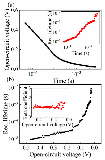 (a) Open-circuit voltage decay; the inset shows the recombination lifetime (τ) as a function of time. (b) τ vs. Voc; the inset shows the dependence of β on Voc.