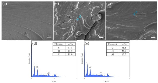 Fracture surface morphologies of coatings: (a) EP coating, (b) Al2O3/EP coating, and (c) PEI−Al2O3/EP coating. EDS point of: (d) d in (b) and (e) e in (c).