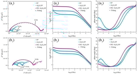 EIS results of all coatings after different immersion times: (a1–a3) 3 days and (b1–b3) 20 days.