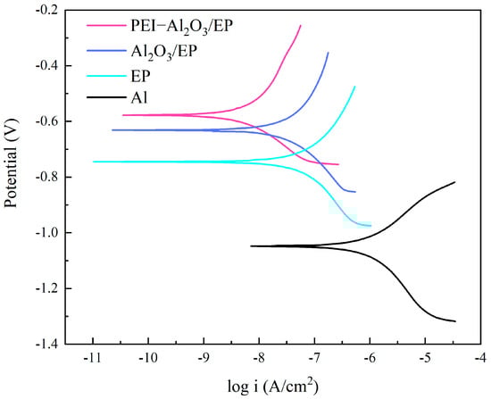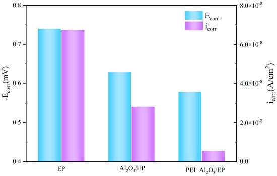 The anticorrosion properties of the as-prepared coatings were further analyzed using a potentiodynamic polarization test. The potentiodynamic polarization curves of all coatings immersed in 3.5 wt.% NaCl solution for 12 h are shown in Figure 6. The corrosion potentials (Ecorr) and corrosion current densities (icorr) are shown in Figure 7. Typically, a more positive Ecorr and a smaller icorr in the polarization curve indicate a lower corrosion tendency and a lower corrosion rate, respectively [36]. The Ecorr of the PEI-Al2O3/EP coating (−0.579 V) was higher than that of the Al2O3/EP coating (−0.628 V) and the EP coating (−0.740 V). With the addition of nanofillers, the icorr of the Al2O3/EP and PEI-Al2O3/EP coatings both decreased. Moreover, the icorr of the PEI-Al2O3/EP coating (5.388 × 10−9 A·cm2) was lower than that of the Al2O3/EP coating (2.8195 × 10−8 A·cm2), indicating that a composite coating with homodisperse nano-Al2O3 exhibits better corrosion resistance.