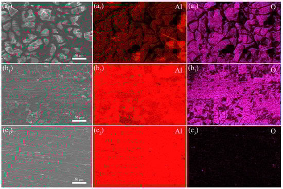 Surface morphology and element mapping of different coated substrates after immersion: (a) EP coating, (b) Al2O3/EP coating, and (c) PEI−Al2O3/EP coating.