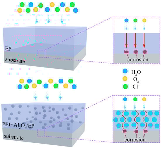 The anticorrosion mechanisms of the coatings are exhibited in Figure 11. The organic coating acts as an important protective layer that can protect the substrate from aggressive media. However, for the pure EP coating, there were a considerable amount of micropores within the coating, and corrosive media (H2O, O2, Cl−) could penetrate into the coating quickly through these micropores. For the Al2O3/EP coating and the PEI-Al2O3/EP coating, the nano-Al2O3 could fill the defects in the coating and create tortuous diffusion paths, thus reducing the diffusion rate of electrolytes. However, for the Al2O3/EP coating, the agglomeration of nano-Al2O3 restricted the enhancement of its anticorrosion properties. PEI-Al2O3 with good dispersion could maximize the diffusion paths of the aggressive media within the coating. Therefore, the PEI-Al2O3/EP coating has the better anticorrosion properties.