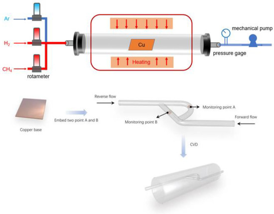 Chemical vapor deposition (CVD) is a potential method used to produce large-area and uniform graphene. However, as noted in the previous section, in the chemical vapor deposition system, the carbon source, substrate, catalyst, and deposition conditions (temperature, pressure, time, etc.) are all parameters affecting the deposition effect [1]. Of these, fluid dynamics is one of the main factors, and computational fluid dynamics (CFD) is thus adopted. The growth temperature, pressure, and the surface deposition rate can be simulated, and the optimal reaction conditions can be optimized or improved according to the simulation results.