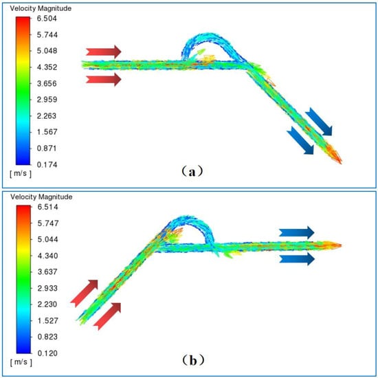 Under atmospheric pressure (AP) conditions, Fluent 2021R simulation results show that, as in Figure 2, both the left and right ports of the channel can be used as the inlet and outlet flows; the right and left ends are defined as the inlets for the forward and reverse flows, respectively. The forward and reverse flow directions refer to the direction of less and greater resistance, respectively, in the fluid flow process. When the fluid flow direction changed, the inlet and outlet sections switched, and the bifurcation section consisted of a straight and curved channel. Forward flow is defined as fluid entering the T45-R Tesla valve from the channel in common with the bifurcated section, whereas reverse flow is defined as fluid entering from the opposite end. Velocity clouds of the forward and reverse flows were obtained under a 2 mL/min fluid flow rate with the inlet as the boundary condition, as shown in Figure 5.