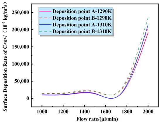 According to previous research [4,5,10], the temperature of graphene prepared by CVD on the surface of a copper substrate is approximately 1273 K and the melting point of copper is 1353 K. Therefore, for the simulation of the deposition rate with temperature, the Tesla valve structure was used to select temperatures of 1230, 1250, 1270, 1290, 1310, and 1330 K in order, according to the previous literature. The selection of intake flow rate is adjusted based on the research by Truong and Nguyen, and the simulation results are shown in the Figure 6. The flow rate was finally selected at 2000 μL/min. The CVD growth of graphene was simulated at two different pressures, atmospheric (AP-101,325 Pa) and low (LP-660 Pa). The temperature of the copper substrate reaction surface was varied to calculate the Di values and graphene surface at 1230, 1250, 1270, 1290, 1310, and 1330 K.