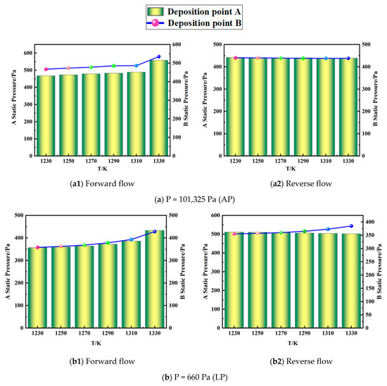Atmospheric and low pressure drop with different temperatures in forward (a1,b1) and reverse (a2,b2) flow: (a) AP (101,325 Pa) and (b) LP (660 Pa).