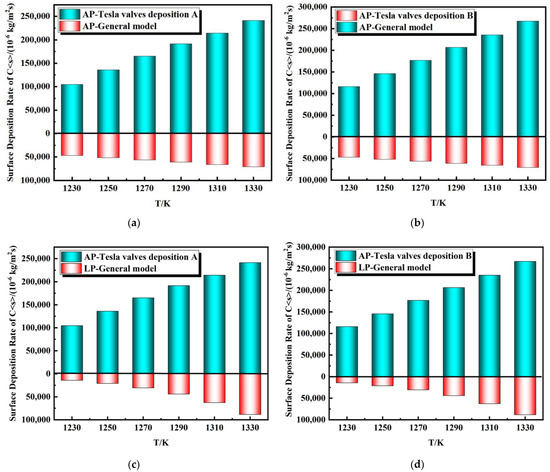 Atmospheric and low surface deposition rate of c<s> with different temperature in reverse flow: (a) AP deposition A; (b) AP deposition B; (c) LP deposition A; (d) LP deposition B.