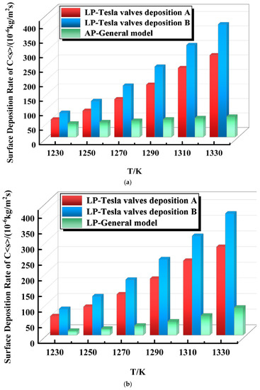 As shown in Figure 10, under different pressure conditions, the graphene surface deposition rate increased with a rise in temperature in both flow directions at both monitoring points, A and B. Although the Tesla valve at the sink point B under atmospheric pressure has a good control effect on the flow direction of nanofluids at a high temperature, the influence of temperature gradually weakens when the temperature rises to 1290 K (in Figure 11a). The results show that the gas mixture flowed in the reverse direction, and most of the fluid flowed into the curved channel, leading to the surface diffusion rate of carbon. However, generally speaking, compared with the existing straight tube model [5], the graphene surface deposition rate (see points A and B in Figure 11) increased by two orders of magnitude in the Tesla valve structure. Therefore, the application of this special structure of the Tesla valve can greatly improve the graphene surface deposition rate, which is more conducive to the generation of large-area, high-density graphene.