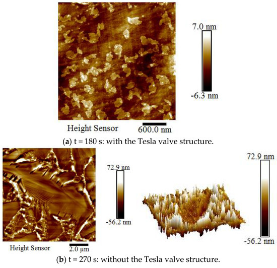 (a) Time = 180 s with the Tesla valve structure; time = 270 s Atomic Force Microscopy (AFM) topography of copper foil (b) without the Tesla valve structure and (c) with the Tesla valve structure. The blue arrows represents different layers after AFM characterization.