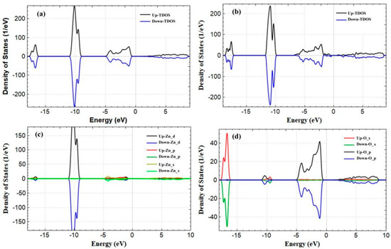 DOS and PDOS plots of ZnO nanowires: (a) pure TDOS, (b) Mn/Co co−doped TDOS, (c) pure PDOS of Zn atoms, (d) pure PDOS of O atoms.