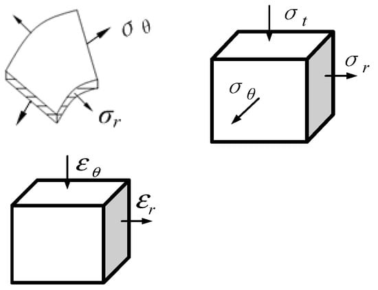 As a result of the local effect of the forming tool, the metal material in the deformation area undergoes plastic deformation under the action of radial and tangential tensile stresses. In other words, the material is in a state of two-way tensile stress, the billet is radially stretched, the thickness direction is thinner, and the tangential direction has not changed. Figure 2 shows the stress-strain relationship. The constitutive equation reveals the following relationships [30,31]: