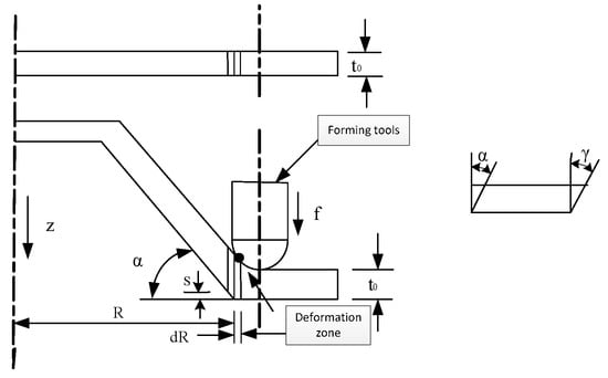 According to this assumption, only the shear strain on the plane occurs in the deformed material. It can be seen from Figure 3 that R is the distance from the center of the blank to the axis of rotation, and s is the unit having a thickness of and sliding along the axis. Therefore, the shear strain is equal to the distance s of the axial slip of the element divided by its thickness :