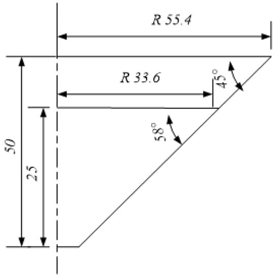 To verify the validity of the previous deformation force calculation formula, two conical parts, with forming angles of 45° and 58°, heights of 50 mm and 25 mm, and opening radii of 55.4 mm and 33.6 mm, are designed, as shown in Figure 5 and Figure 6. The material of the designed punches is tool steel, and the diamond film is sputtered after quenching. The surface of the processed punch is intact and can meet the requirements of high-performance forming applications.
