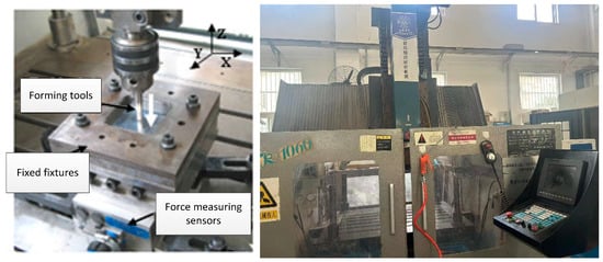 The deformation force was measured using a Kistler 9443B three-way piezoelectric dynamometer. The fixture for securing the metal sheet was placed above the dynamometer (Figure 7), so that the forming tool operates on the metal plate during the forming process. The material’s force will be completely transmitted to the dynamometer.
