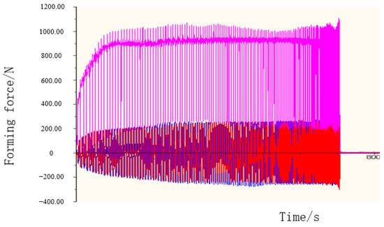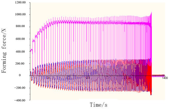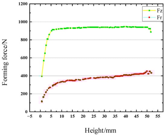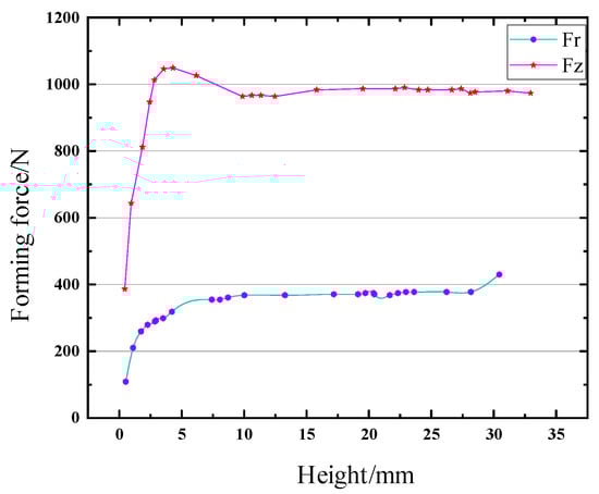 The deformation force in the direction is periodic. During the forming process, each contour layer can be considered as a cycle with two peaks. The two peaks have essentially the same size and opposite directions. The radial deformation force on the modified forming plane is defined as the average of the absolute value of the peak value, while the axial deformation force is defined as the average value of the z-direction force at any ten points on the contour layer, as shown in Figure 11 and Figure 12.