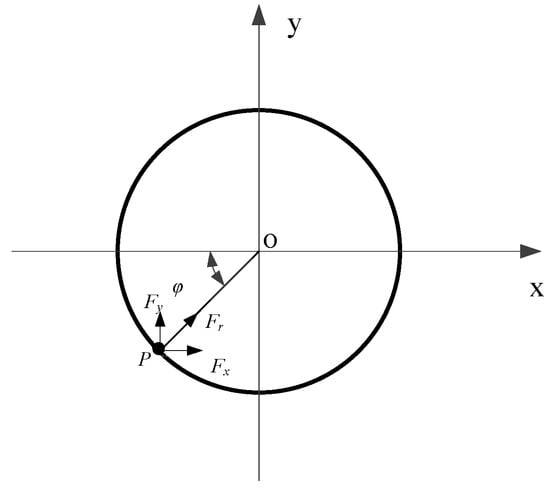 Deformation forces in three directions can be obtained by measuring using a Kistler 9443B three-way piezoelectric force gauge, as shown in Figure 8 and Figure 9. The relationship between the deformation forces ,, and the radial forming at any position P on the forming plane is given by (Figure 10):