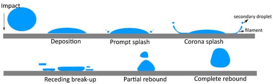 In situations where the droplet impact velocity is high, a prompt splash might happen, which results in the generation of several small droplets. The splashing of a droplet can be in the form of a prompt splash, corona splash, receding breakup, or partial rebound (see Figure 3), and thus there is no unique definition for the splashing phenomenon. Generally, it is perceived by the fragmentation of the liquid into secondary droplets. Prior to the creation of secondary droplets, ligament formation and fingering might be observed. In a corona splash, small droplets are mainly formed around the rim after the collision occurs [55,62]. In addition to the parameters related to the droplet impact, a new parameter, , which incorporates the inertia, viscous stress, and surface tension, is defined to demonstrate the transition from spreading to splashing regime (also known as the splashing threshold). This threshold would be useful in order to predict the splashing behavior, which mostly refers to prompt and corona splashes [55,62]. In general, the surface roughness and the properties of the surrounding gas have significant effects on this threshold.