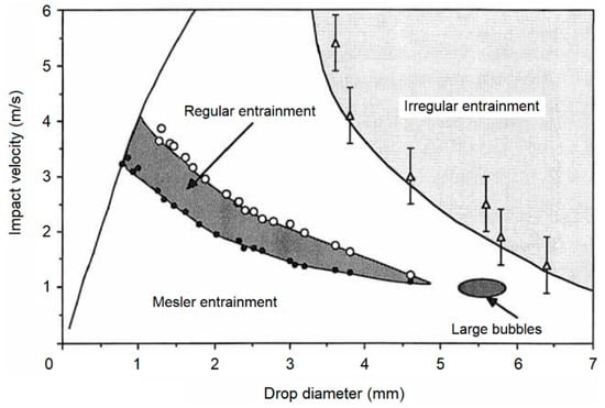 Pumphrey′s diagram based on droplet impact velocity and diameter for droplet impact on a liquid pool (reproduced from Reference [133] with permission (Copyright Cambridge University Press 1990)).