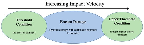 The interaction of a liquid droplet with a metallic surface creates an impact pressure as described in Section 3. In most cases, however, the stresses generated by the impingement of a single droplet are insufficient to induce erosion damage. Multiple and repetitive droplet impacts on the same spot are needed to result in erosion damage in a way akin to fatigue failure [14,210,211]. The mechanisms by which the stresses from the individual droplet impacts sum up to cause erosion damage is not well understood [22]. Nevertheless, it is empirically established that the outcome of the droplet impact process depends markedly on the impact velocity and that different ranges of impact velocity result in different liquid impingement erosion “regimes” [210,212]. These consist of an erosion damage regime bounded by two thresholds (lower threshold and upper threshold), as illustrated in Figure 7. The most important of these is the lower threshold condition and erosion damage regime.