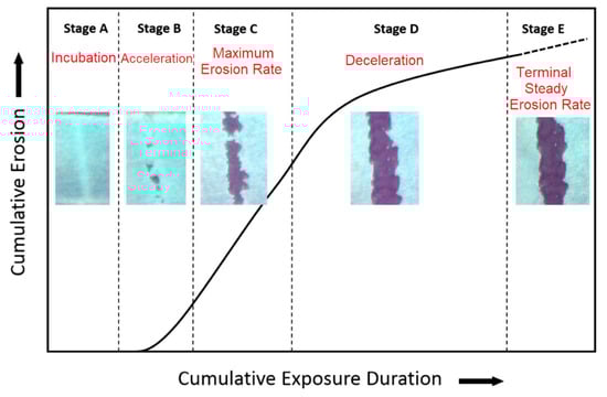 When the impact velocity is higher than the threshold velocity, the erosion damage regime is activated. For bulk metallic materials, erosion damage in this regime shows a significant time-dependent behavior, displaying varying rates of erosion at different time intervals, which leads to a non-linear pattern of damage progression [212]. The erosion graphs are typically used to illustrate this behavior. In Figure 8, the typical erosion curve, often referred to as S-shaped, is schematically illustrated. It should be pointed out that this behavior is commonly seen in water droplet erosion (WDE) of nearly all bulk materials. The erosion curve is conventionally divided into five different regions or stages, as shown in Figure 8. These stages are referred to as the incubation period (stage A), during which the surface roughness increases because of the repetitive impact of water droplets but with no measurable material loss; the acceleration stage (stage B); the steady-state maximum erosion rate (stage C), where the erosion rate reaches its peak and remains constant for a considerable amount of time; the attenuation or deceleration stage (stage D), where the erosion rate begins to decline; and the terminal stage (stage E), where the erosion rate becomes constant once again. The incubation period (stage A) and the steady-state maximum erosion (stage C) are recognized as the most crucial stages in this regime [212]. This is because the length of the incubation period indicates the resistance of the material to water droplet impacts, whereas the linear relationship between the erosion rate and exposure duration over the steady-state maximum erosion rate stage allows for the anticipation of the amount of erosion damage over a certain period of time. Therefore, metallic materials are usually considered to have superior erosion performance when they have a longer incubation period or a smaller steady-state erosion rate.
