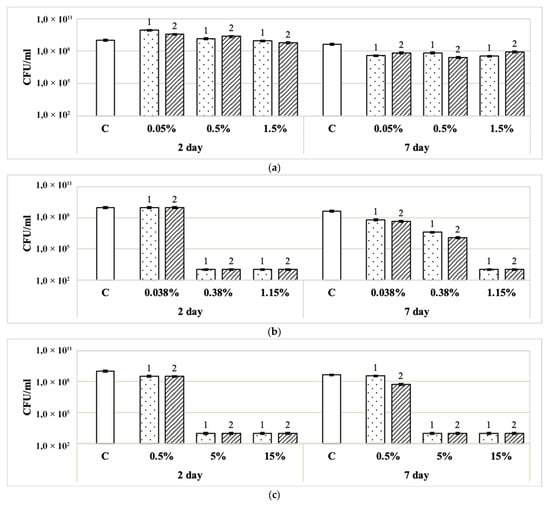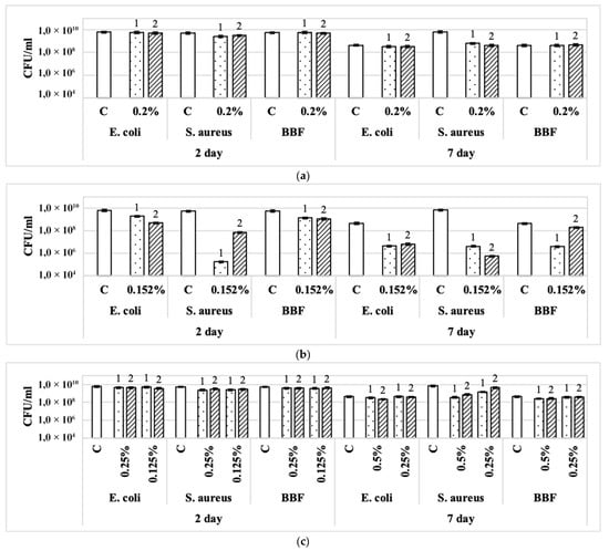 Effect of disinfectants on cell survival (CFU/mL) of monospecies and binary biofilms of E. coli and S. aureus on days 2 and 7 of growth on glass fiber filters: (a) Foodlex OXY (0.2% vol); (b) Dimax Chlor (0.152% vol); (c) BFR Biocide Enzyme (0.125%, 0.25%, 0.5% vol). Designations: 1—action 10 min; 2—action 30 min. BBF—binary biofilms.