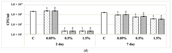 Effect of disinfectants on cell survival (CFU/mL) of binary St. aureus + S. typhimurium biofilms on days 2 and 7 of growth on paper filters: (a) Foodlex OXY (0.0.5%, 0.5%, 1.5% vol); (b) Dimax Chlor (0.038%; 0.38%; 1.15% vol); (c) BFR Biocide Enzyme (0.5%, 5%, 1.5% vol); (d) peracetic acid (0.05%; 0.5%; 1.5% vol). Designations: 1—action 10 min; 2—action 30 min.