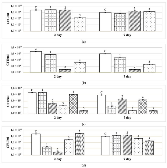 Combined effect of disinfectants (in recommended concentrations) and adjuvants of different chemical nature on bacteria survival (CFU/mL) in binary biofilms (St. aureus + S. typhimurium) on days 2 and 7 of their growth on paper filters: (a) Foodlex OXY (0.0.5%); (b) Dimax Chlor (0.038%); (c) BFR Biocide Enzyme (0.5%); (d) peracetic acid (0.05%). Adjuvant designations: 1—hexylresorcinol (0.02%); 2—ethyl alcohol (30%); 3—isopropyl alcohol (30%); 4—hydrogen peroxide (3%); 5—hydrogen peroxide (6%).