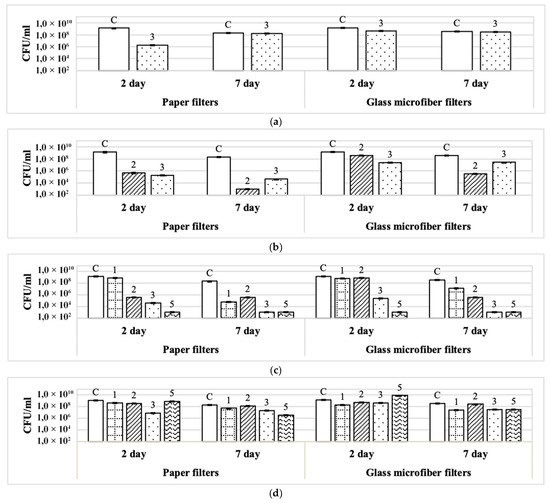 Comparative effects of disinfectants (in recommended concentrations) and adjuvants of different chemical nature on cell survival (CFU/mL) in 2- and 7-day binarybiofilms (St. aureus + S. typhimurium) grown on paper filters and glass fiber filters: (a) Foodlex OXY (0.0.5%); (b) Dimax Chlor (0.038%); (c) BFR Biocide Enzyme (0.5%); (d) peracetic acid (0.05%). Adjuvant designations: 1—hexylresorcinol (0.02%); 2—ethyl alcohol (30%); 3—isopropyl alcohol (30%); 4—hydrogen peroxide (6%).