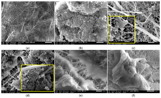 Figure 5a shows multicellular conglomerates of cells from a mixed biofilm culture of St. aureus + S. typhimurium. The arrays of cells, united by a well-formed matrix, are situated within the interweaving of glass fibers. After exposure to BFR Biocide Enzyme (10 min), depressions appeared in the biofilm due to matrix breakdown, some cells appeared “naked”, outside the matrix, but no critical changes in the BF structure were observed (Figure 5b). After exposure to H2O2 (10 min), the matrix was partially destroyed; small caverns and individual clots of matrix are visible (Figure 5c). After the combined action of disinfectants with the adjuvant (H2O2), wide and deep gaps were visible in the biofilm as a consequence of matrix destruction (Figure 5d), as well as many cells torn into halves (black hemispheres on Figure 5d). Treatment with isopropanol led to aggregation of the BF matrix, which was evident from its cracking and the appearance of gaps between the BF pieces (Figure 5e). The addition of BFR Biocide Enzyme did not change the picture much. Figure 5f shows the matrix clot and behind it the gaps leading deep into the biofilm.