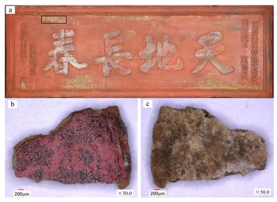 According to the literature, the decoration of inscribed horizontal plaques belongs to the lacquering craft []. Artifacts that also belong to the lacquering craft include coloured drawings in ancient buildings, lacquerware, etc., whose materials and techniques have been explored [,,]. However, there are no reports on scientific studies focusing on the materials and techniques for inscribed horizontal plaques. In this study, a digital microscope system, SEM-EDS, μ-FTIR, and XRD were used to analyse the materials and techniques used on this plaque to provide new evidence for the traditional techniques used on inscribed horizontal plaques and references for the further protection and restoration of inscribed plaque artifacts.
