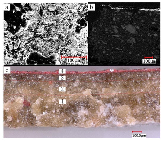 From SEM micromorphology of the red surface layer (Figure 2a, 600× magnification), it was seen that the particles are fine, but there are a large number of cracks, which indicates that the coloured decoration surface has undergone a certain degree of aging. The cross sections from SEM (Figure 2b, 100× magnification) and the digital microscope analyses (Figure 2c, 200× magnification) show that there are four layers. The first, second, and third layers are ground layers. This means that there are three putty layers whose colour is earth-brown with different shades of darkness. The fourth layer is the red surface layer.