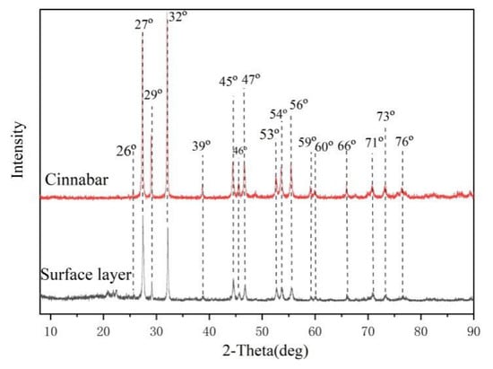 To identify the inorganic substances in the plaque, XRD analysis was conducted on its surface and ground layer. The X-ray diffraction diagram (Figure 4) of the red surface layer shows that the diffraction peaks at 2θ of 27°(vs), 29°(s), 32°(vs), 39°(w), 45°(s), 46°(w), 47°(m), 53°(m), 54°(m), 56°(m), 59°(w), 60°(w), 66°(w), 71°(w), 73°(w), and 76°(w) belong to cinnabar (HgS, Figure 4, JCPD:99-0031). The diffraction peaks of the samples match those of cinnabar well, which shows that the cinnabar used has a good crystal form and high purity.