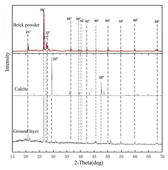 As shown in Figure 5, the diffraction peaks of the ground layer almost match the diffraction peaks of brick powder [] at 2θ of 21°(s), 26°(vs), 28°(s), 36°(w), 39°(w), 41°(w), 42°(w), 45°(m), 50°(m), 55°(w), 60°(w), and 68°(w). This shows that the ground layer contains brick powder. The diffraction peaks at 21°, 26°, 36°, 39°, 41°, 42°, 45°, 50°, 55°, 60°, and 68° are attributed to the gismondine phase (CaAl2Si2O8·4H2O, JCPD:20–0452). The peak at 28° is attributed to the albite phase (Na(AlSi3O8), JCPD:84–0752) []. The diffraction peaks of the ground layer at 2θ of 29° and 48° are not found in the diagram of brick powder. They may be from calcite (CaCO3, Figure 5, JCPD:05-0586), which may form in the reaction between Ca(OH)2 and CO2 [], and the weak diffraction peaks represent its low content.