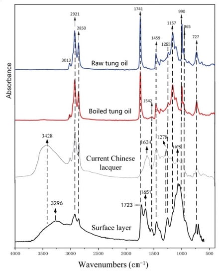 The infrared spectra of raw tung oil, boiled tung oil, the current Chinese lacquer, and the surface layer.