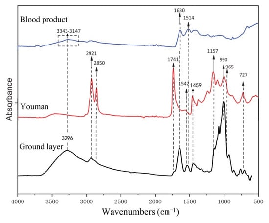 The infrared spectra of the ground layer of the sample, youman, and a blood product (meaning ‘animal blood’) [] are shown in Figure 7. The main component of blood is protein. The wide absorption peaks at 3343–3147 cm−1 belong to the stretching vibration of the N-H in protein. The absorption peak at 1630 cm−1 belongs to the stretching vibration of C=O in amide bonds. The absorption peak at 1514 cm−1 belongs to the deformation vibration of C-N. Comparing the infrared spectra of the sample, youman, and blood, it is deduced that the absorption peaks of the infrared spectra of the ground layer at 2921, 2850, 1741, 1542, 1459, 1157, and 990 cm−1 belong to youman, which consists of flour, lime water, and boiled tung oil []. In the youman component, lime water absorbs CO2 from the air to form calcite, which is consistent with XRD results. The absorption peaks at 3296, 1630, and 1514 cm−1 belong to the blood product, which is usually added to the ground layers of coloured drawings in ancient Chinese buildings to increase intensity. In summary, the ground layer may contain the blood product and youman.