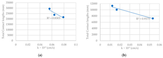 Correlation of total aggregate contact lengths calculated for the skeleton with permeability, (a) AC60/70 with dense gradation, (b) AC60/70+CB with dense gradation, (c) AC60/70+SBS with porous gradation, and (d) the combination of dense gradation set (a,b).