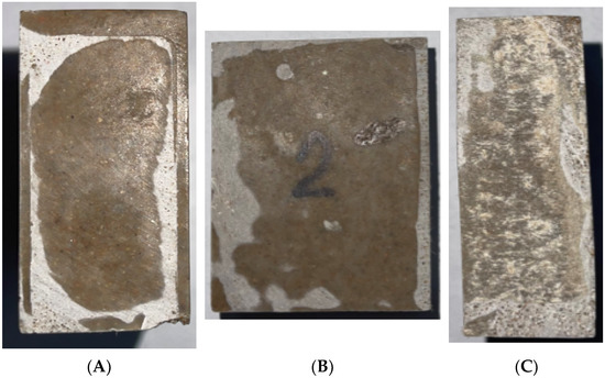 Sample No. 3 (polymer-concrete composition No. 15). (A) Top view; (B) Front (main) view; (C) Right side view.