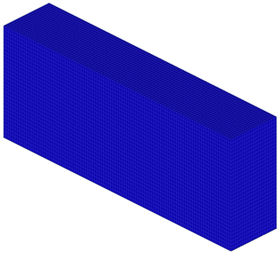 An important aspect of the simulation studies was generating the correct finite element mesh (FEM). A standard procedure is followed when creating a computational model of representative blocks. Second-order three-dimensional pyramidal elements were used in the discretization process. To accurately represent the distribution of internal stresses in blocks under the impact of external forces, it is necessary to pay attention to the distribution of the finite element mesh. Figure 3 and Figure 4 show the finite element mesh applied to polymer-concrete samples. The unsprayed polymer sample was divided into 67,872 nodes and 62,000 elements, and the sprayed polymer sample was divided into 72,114 nodes and 66,000 elements.