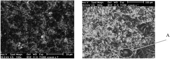 The result of coating a single sample of polymer concrete. (A) Coating based on powdered alloy MetaCeram 28010—Cr2O3 in a single sample of polymer concrete (composition No. 23); (B) coating based on powdered alloy SF PE 8215—Ni-7Cr-3Fe + 60% WC in a single sample of polymer concrete (composition No. 23).