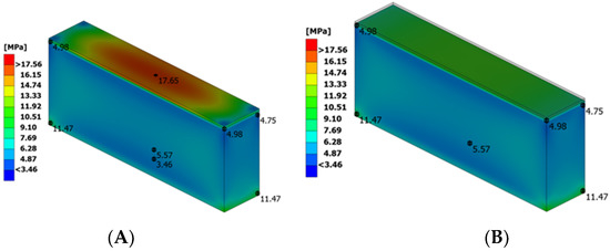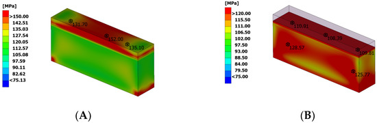 The results of the static analysis (spraying Cr2O3 + polymer 23). (A) Stress concentration in the spraying surface layer; stress concentration on the surface of spraying; (B) stress concentration on the polymer concrete under spraying (the spraying layer is hidden).