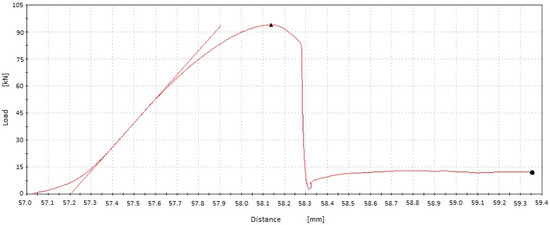 The experiment was carried out under normal conditions, with the ambient temperature being 25 °C and the humidity being 60%. Using the INSTRON 5980 technical equipment of the Universal Testing System, an axial force of 93.94 kN was applied, at which point the sample structure was destroyed (Figure 13). The sample failure graph is shown in Figure 14, and the descriptions of the failure graph are presented in Table 16.