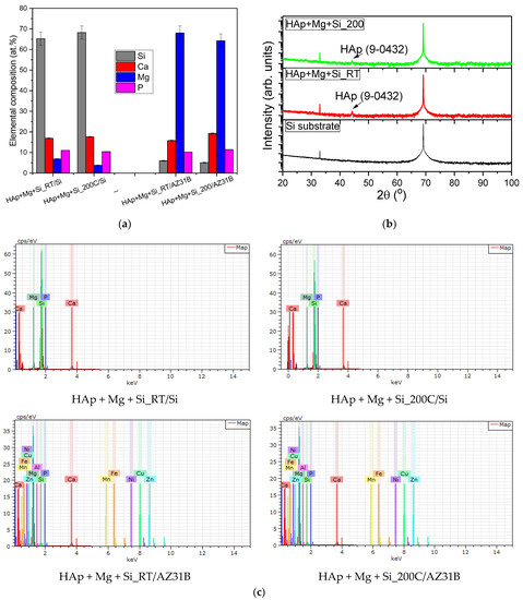 The EDS investigations were performed on the coatings deposited on the Si wafers substrate for determining the Mg content and on the Mg alloy substrate for determining the Si content. This research design was made in order to eliminate the influence of the Mg or Si element from each substrate. The chemical composition is presented in Figure 1a. The EDS spectrum of each coating is presented in Figure 1c. One may observe that Si and Mg content is up to ~7 at.%, indicating the formation of HAp-doped coatings. The Ca/P ratio was calculated at about 1.53 for the coating deposited at RT and 1.68 for those prepared at 200 °C. This finding showed that an increment of the deposition temperature assured the formation of a stoichiometric HAp structure. Usually, for the doped HAp coatings, the (Ca + Si + Mg)/P ratio is calculated, but in the case of the present paper, it was impossible to be evaluated because the substrates were Si or Mg alloy, having at least one element found in the coating. However, based on the EDS spectrum (Figure 1b), there are seen a small amount of some elements of bare Mg alloy, such as Zn. Other elements, such as Mn, Fe, Cu, and Ni, are too small to be detected by the EDS system.