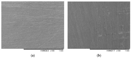 The 2D SEM images acquired for the coatings deposited directly on AZ31B alloys are presented in Figure 3. In both cases, the grooves’ presence at 100× magnification is a common feature expected after the polishing process of AZ31B alloys before coating.