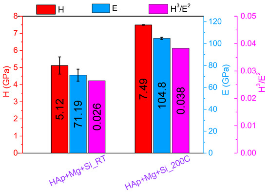 The results indicated that the mechanical properties of the coatings differ significantly depending on the deposition temperature increment from RT to 200 °C. It was shown that both the hardness and reduced modulus of the coatings increase by approximately 47% as the deposition temperature increases. These results are consistent with our previous findings [47]. The selection of appropriate biomaterials as protective coatings for bare metallic implants is crucial and requires a balance between their hardness and friction properties [48]. One common parameter used to evaluate a material’s resistance to plastic deformation is the H3/Er2 ratio, which has also increased from 0.026 to 0.038. This suggests that the HAp + Mg + Si_200 °C sample may have superior resistance to plastic deformation when compared to the HAp + Mg + Si_RT sample.