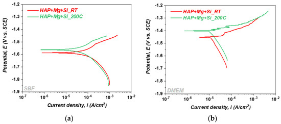 In DMEM, the values of the Ecorr parameter for both coatings are close to each other, while the icorr value was found to be smaller for the coatings prepared at 200 °C, suggesting that an increment of the deposition temperature leads to higher corrosion resistance.