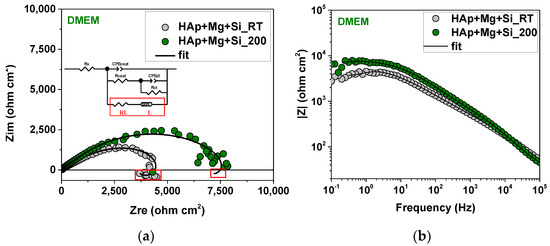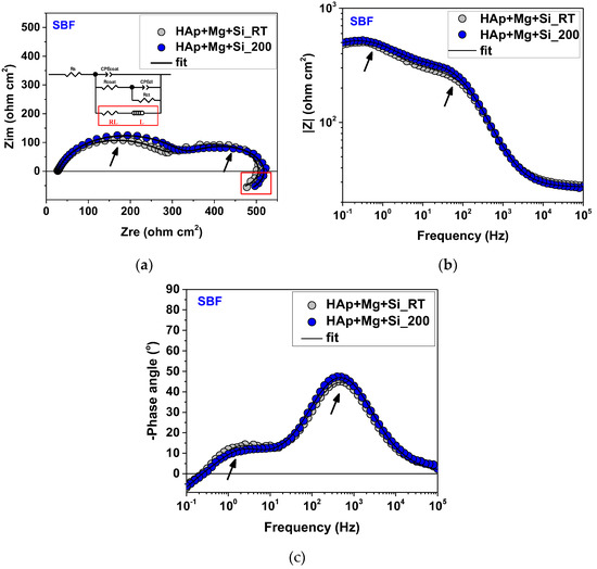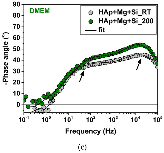 Figure 6 and Figure 7 display the Nyquist and Bode plots of the investigated samples immersed in SBF and DMEM electrolytes after the stabilisation of the open circuit potential for 3600 s. Two defined time constants (indicated by arrows in Figure 6 and Figure 7) characterised the HAp + Mg + Si samples, more visible in the case of the SBF test medium. Additionally, for both conditions, the Nyquist plot reveals the presence of an inductive loop in the low-frequency range (emphasised by a red square). According to Flores et al. [49], the time constant present in the medium frequencies range (MF) provides information related to coating–electrolyte interface, while the impedance data present in the low-frequency range (LF) shows the occurrence of a corrosion process at the substrate–solution interface. Thus, the presence of an inductance loop in LF is often associated with the absorption of chloride ions through cracks and defects, causing the initiation of corrosion phenomena on the surface and, consequently, a decrease in substrate resistance [50]. Also, the high rate of Mg ions dissolution caused by low applied frequencies can be a responsible process as well [51].