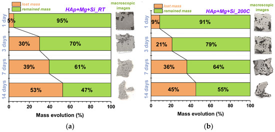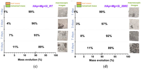 Table 5 presents the samples mass loss expressed in mg, while Figure 8 presents the samples mass evolution (mass of the remained material along with the lost mass) expressed in percentages after each time interval (1, 3, 7 and 14 days), accompanied with macroscopic images of the samples.