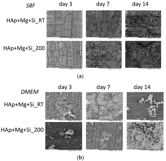 Figure 9 presents the SEM images with the material’s surface morphology after performing the immersion assays in both testing media, SBF and DMEM, respectively. According to the SEM images, it can be noted that in SBF, both coatings begin to present cracks after three days of immersion. The cracks were visible, irrespective of the immersion period. Starting the seventh day of immersion, on the material’s surface, some small deposits start to appear, which after 14 days of immersion tend to agglomerate. This can be explained through the competition between biomineralisation (precipitation of some apatite) and biodegradation, a process known as bioactivity. This hypothesis corroborated with the results presented in Table 5 and Figure 8 highlights that, in this case, the degradation process is accelerated by the presence of Mg in the coating but also in the substrate. Moreover, as can be observed in Figure 9a, the presence of the cracks allows the SBF to reach the substrate, accelerating so the degradation of the experimental samples.