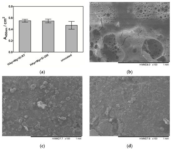 Figure 10c,d displays 2D SEM images acquired for the mussel-derived peptide bound to the AZ31B substrates with HAp + Mg + Si_RT and HAp + Mg + Si_200 coatings deposited prior to peptide coating. In both cases, the SEM images show a similar coating of the material surface with the mussel-derived peptide, which is in line with the results obtained from the ELISA-like assay. Samples without previous HAp + Mg + Si coating (designated as uncoated) showed less peptide bound on the surface in both ELISA-like assay and SEM imaging (Figure 10b).