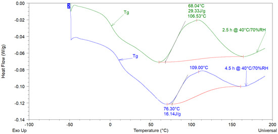 MDSC heat scans for the product 2 after isothermal curing for 2.5 h and 4.5 h at 40 °C/70% RH. Glass transition temperature (Tg) development, remaining fractional heat of reaction (Ht), and increasing curing time are also indicated.